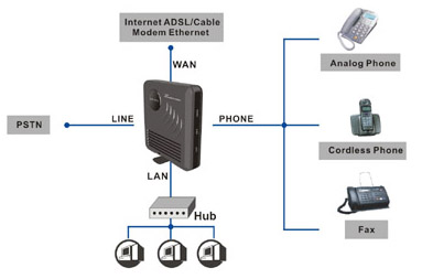 SIP-GW2 is analog telephone adaptor with SIP protocol, one WAN interface to internet, one LAN interface to PC, 1 FXS for regular phone, 1 FXO for PSTN call relays. All cordless phones and regular phones can be used to make and receive VoIP call. Phone can be used to make regular call at the same time. Phone rings for all incoming VoIP and PSTN calls, VoIP or PSTN calls selected by phone key (**).